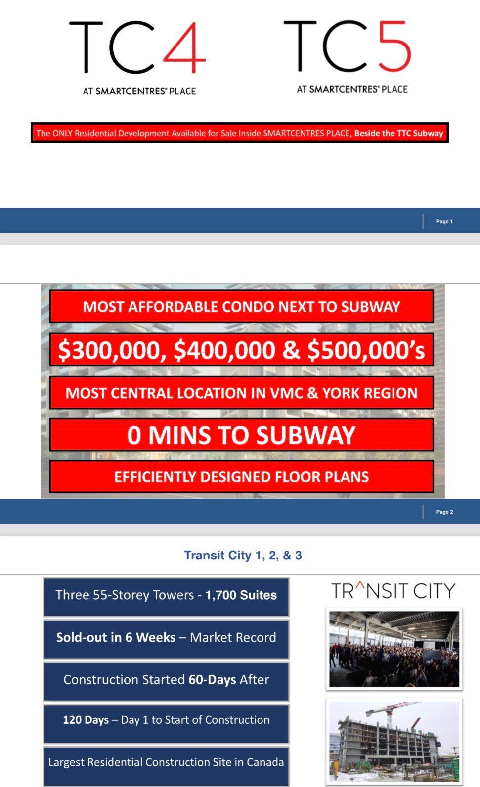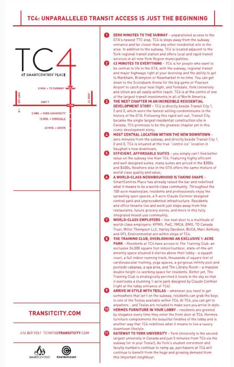 Transit City Condos 4期公寓楼盘位于在旺市Weston/Highway 7,由著名发展商CentreCourt开发,是旺市Smart Centres社区规划中的一部分,在整个占地超过100万英亩的总体规划中是距离地铁站入口最近的一栋楼。具体位置最佳,户型最实用。