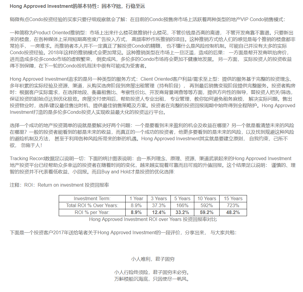 无论做一个投资者, 还是一个职业经纪人, 走在成功的路上需要的不仅仅是凭运气Luck。更需要的是:激情Passion, 眼界Vision, 勤奋Hard Working 和 替人着想Thoughtful的态度。以上的想法仅为一家之言,用以抛砖引玉。有意见或想法的朋友, 无论你是首次购房者、地产投资人、还是持牌地产经纪人,都欢迎和笔者联系, 我们共同探讨或参与到Hong Approved Investment的系统合作平台中。未来的地产投资,合作才能共赢,多伦多地产投资的路上, 我不孤单,缘来有你。
