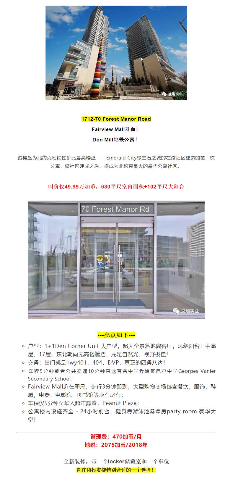 【盛地独家暗盘】北约克绿宝石社区70 Forest Manor中高层1+1带车位,叫价49.99万加币!