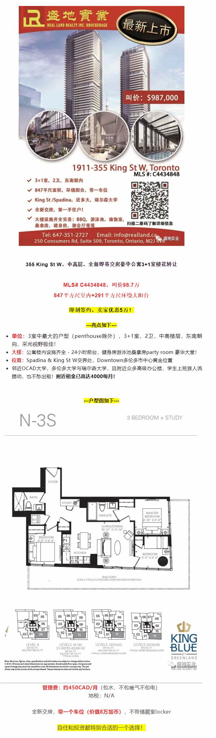【盛地楼花团队】King Blue楼花转让3+1大户型,叫价90余万!