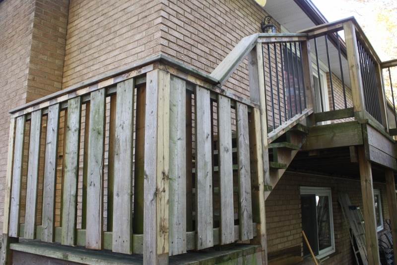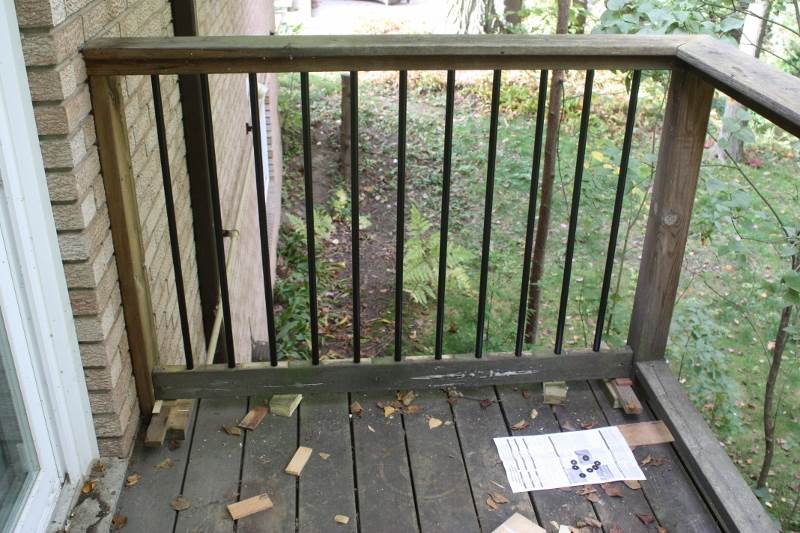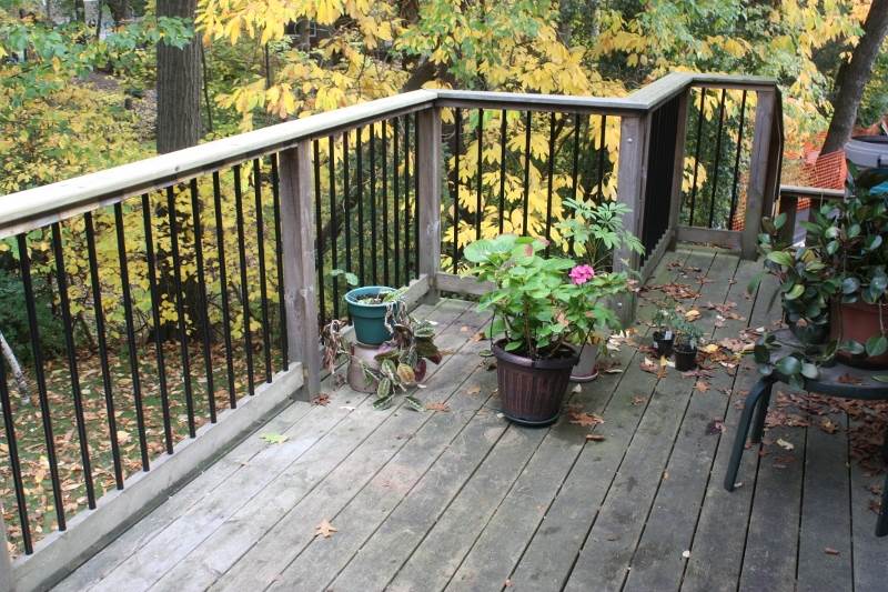 我要改建这个阳台,除了扩大一点面积外,另一个重点就是变换栏杆。原来是用1x6的宽木板做栏杆,栏间透光的空隙只剩下了约40%。我这房的一大特色是背对溪谷树林,这栏杆的遮挡真是大煞风景,辜负了天赐的景色,所以一定要改变,清除障碍,还我绿荫。旧貌。