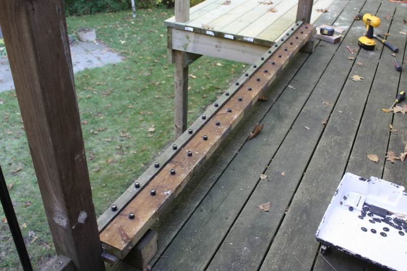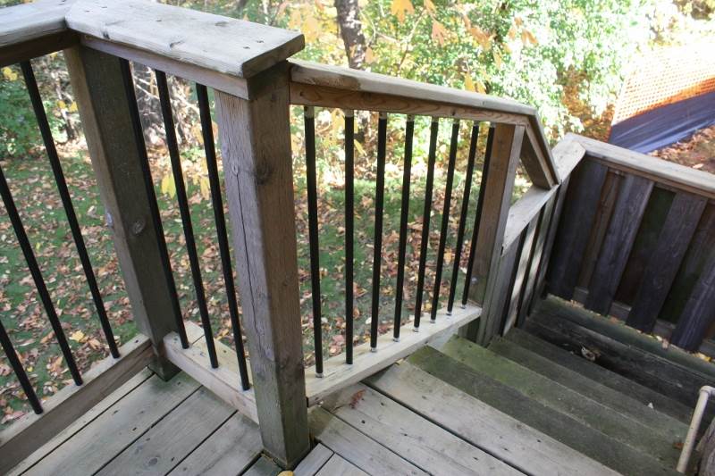 从另一端回望,近处就是我扩建改变了的那个角,在这里原木料不适用了,换了三条新木头。对栏杆间隔的要求是不超过4英寸,我在装好后测量,间距是3 ¾英寸。