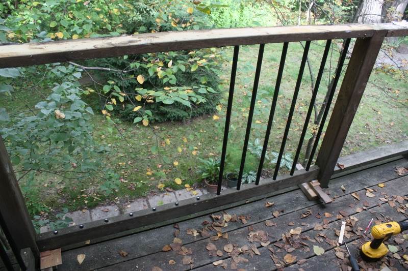 现代做阳台的栏杆,有多种选择。其一是木柱栏杆,是1寸半见方,还是比较粗,改变不大。其二是白色的人造栏杆,或铝制,或塑胶,我觉得人为刻意的痕迹过重,不适合我这个郊野气息的传统房子;还有那样就要完全去掉现有的粗木柱,而这些木柱是上下直通的,不宜锯断,锯了就不结实了。其三是以钢化玻璃代替栏杆,看着更通透,但前提条件是也需要铝制框架,间隔等宽,而我不想锯断的木柱间隔是不等的;还有那玻璃将来还需擦洗,岂不平白又增加了麻烦?其四是在木框架上装金属的细柱,用它我就可以保留原有的木框架,又在自然与现代、安全与透空之间找到了平衡。金属细柱还有两种,一种是扁平弯曲如弓形,另一种是圆柱直棍,我选取后者,是因为便宜、易装、高度合适。颜色有黑和古铜色,我选黑,是为了与木头形成差别对比。