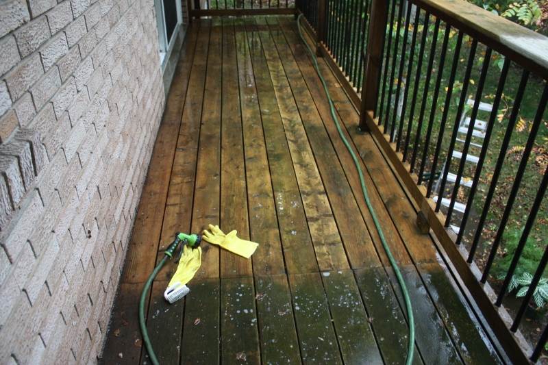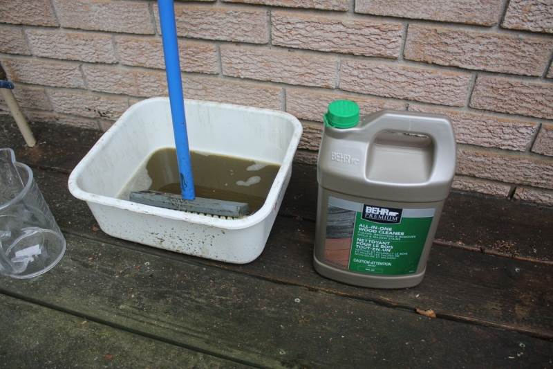 刷洗的材料和工具。从Home Depot买来的木阳台洗涤液,兑一倍水使用。先用水冲湿,然后蘸液体用力刷洗,15分钟后再用水管冲干净。我的水压冲洗机坏了,好在不一定要用它,压力太大了反而会伤木。