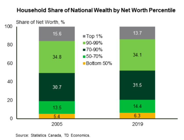该报告显示,加拿大的财富不平等现象已经缩小。在 2005 年至 2019 年期间,前 1% 和 10% 的家庭持有的财富份额有所下降。相反,较低百分位数的净财富有所增加。