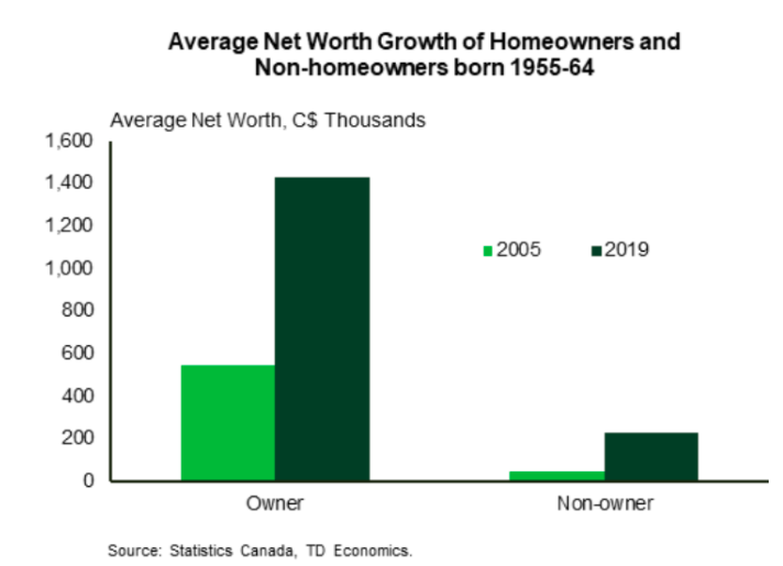 虽然房地产价值目前并未导致财富不平等,但 TD 还发现房主和非房主之间的财富差距确实在扩大。 1955 年至 1964 年间出生的房主的平均净资产现在超过 140 万加币,这是非房主同行的六倍多。