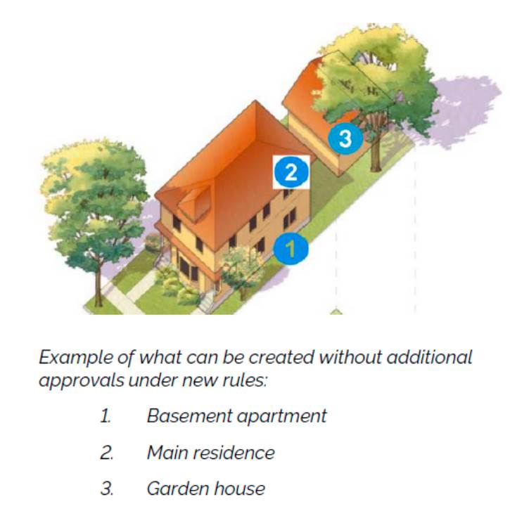 根据该立法,一个住宅地段最多可合并三个单元,无需任何章程修订或市政许可。政府提供的一个例子表明,地下室公寓和花园或后巷屋可以建在房产上并出租给租户。无论市政分区法如何,也可以在单个住宅地段上建造复式和三层式住宅。