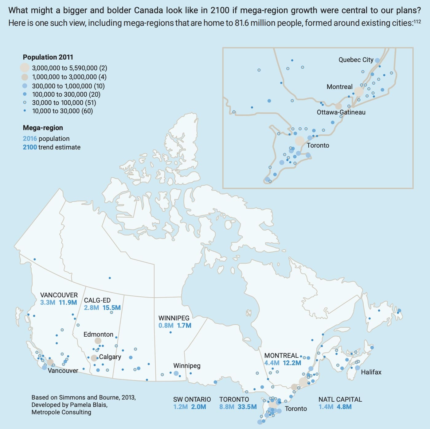 如果该计划得以实施,多伦多地区将有 3300 万人,卡尔加里-埃德蒙顿地区将有 1550 万人,蒙特利尔地区将有 1250 万人,温哥华地区将有 1200 万人。