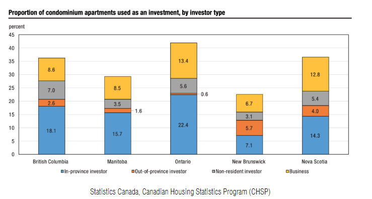 在安大略省,企业拥有 74,485 套用于投资目的的公寓,占比13.4%。而大多数用作投资的公寓由省内投资者拥有,占比为 22.4% 。非居民投资者占公寓业主的 5.6%。