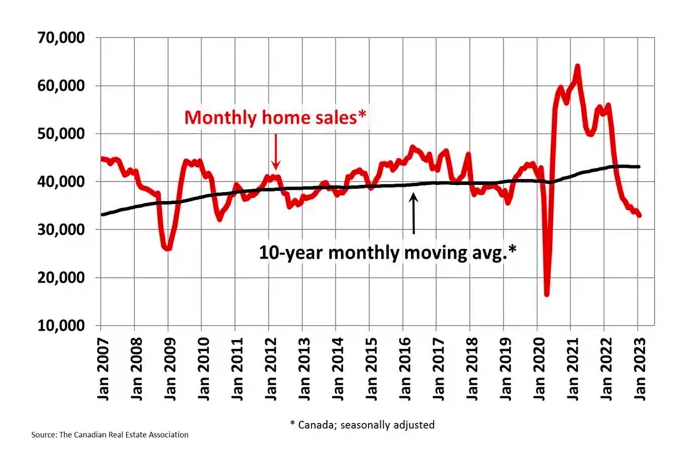 根据加拿大房地产协会(CREA)最新发布的统计数据,1 月份全国房屋销售量不足 35,000 套,同比下降 37.1%,为 2009 年以来的最低水平。
