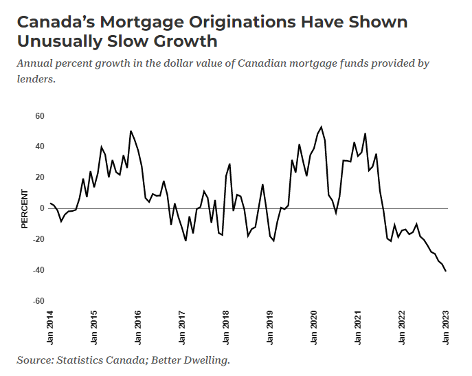 由于较高的利率影响了杠杆率,加拿大的抵押贷款发放异常缓慢。1 月份新抵押贷款基金的价值下降 16.1%(40 亿加币)至 207 亿。