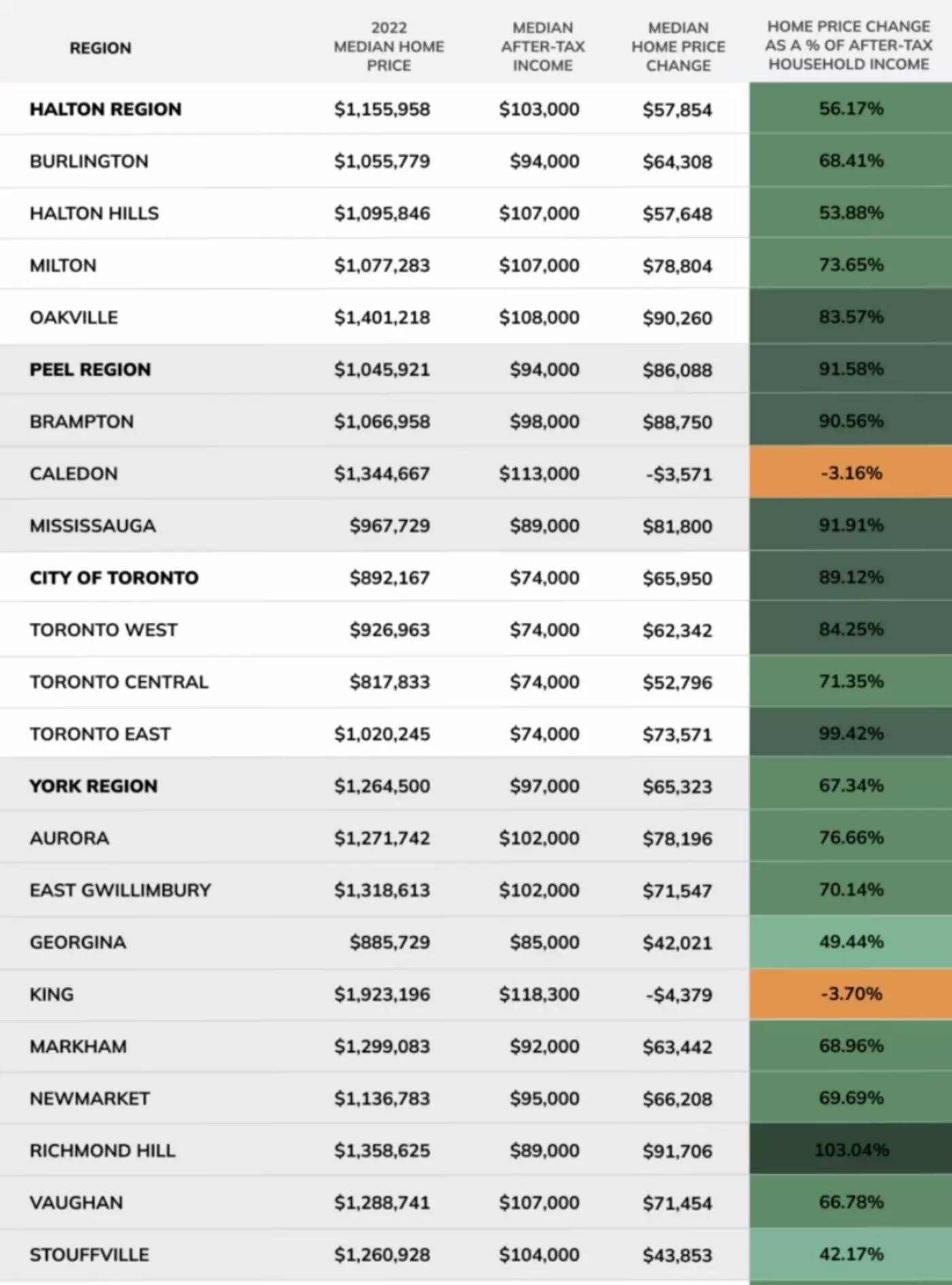 报告中指出,在GTA地区中的20个房地产市场中,房价上涨的幅度均超过了家庭年收入中位数的一半。其中Scugog和Richmond Hill地区的房价涨幅甚至超过了当地家庭年收入中位数的100%!