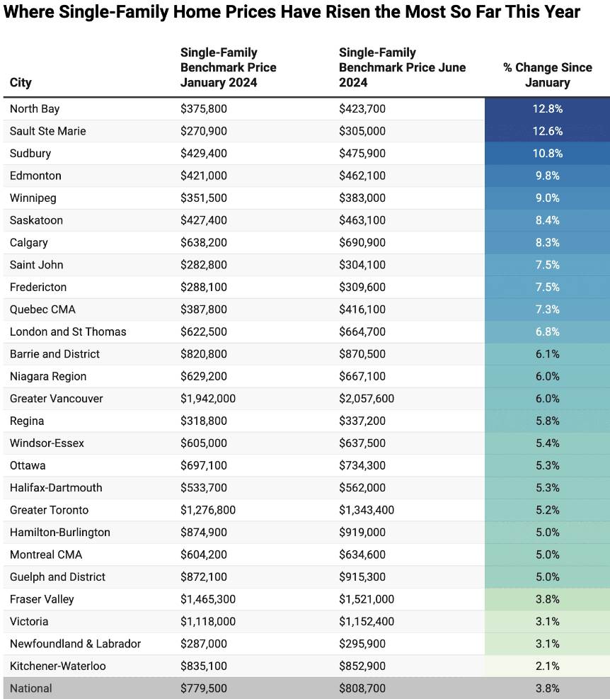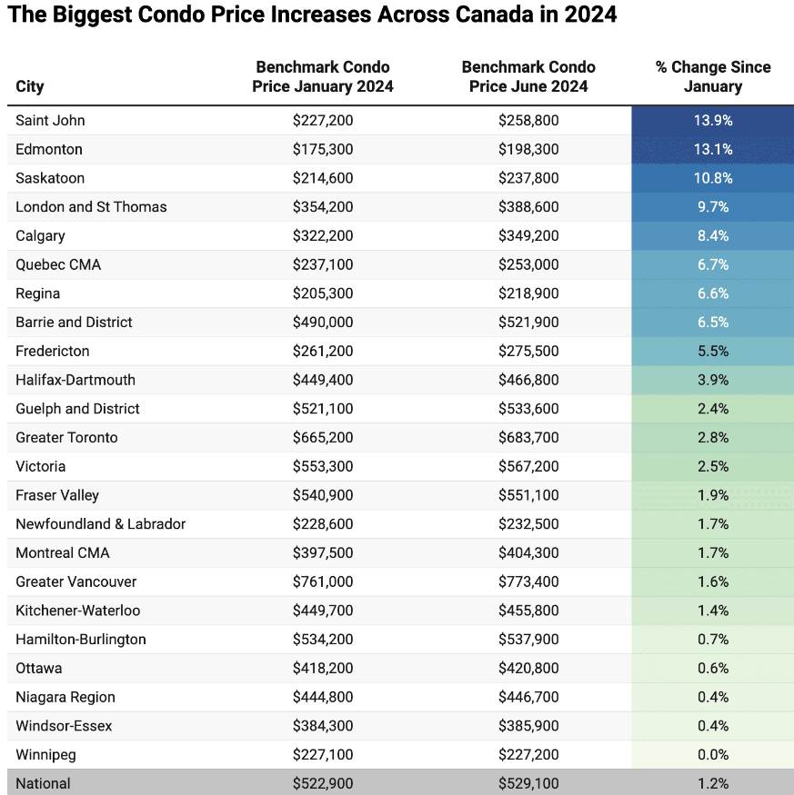 加拿大最具可负担能力的公寓市场也正经历最显著的价格增长。圣约翰、埃德蒙顿和萨斯卡通的公寓价格自1月以来分别上涨了13.9%、13.1%和10.8%。这些地区的公寓需求日益增长,价格增长幅度甚至超过了独栋住宅。同样的情况也出现在伦敦和圣托马斯、卡尔加里和里贾纳。