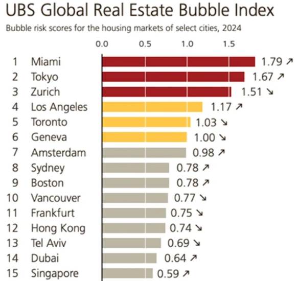 在泡沫风险方面,加拿大城市的情况比迈阿密要好,后者以1.79的得分位居瑞银指数榜首。报告指出,自2019年底以来,佛罗里达州这座城市的房价上涨了近50%,其中7%的涨幅发生在过去四个季度。