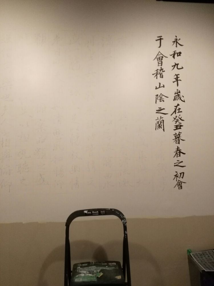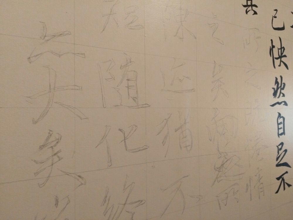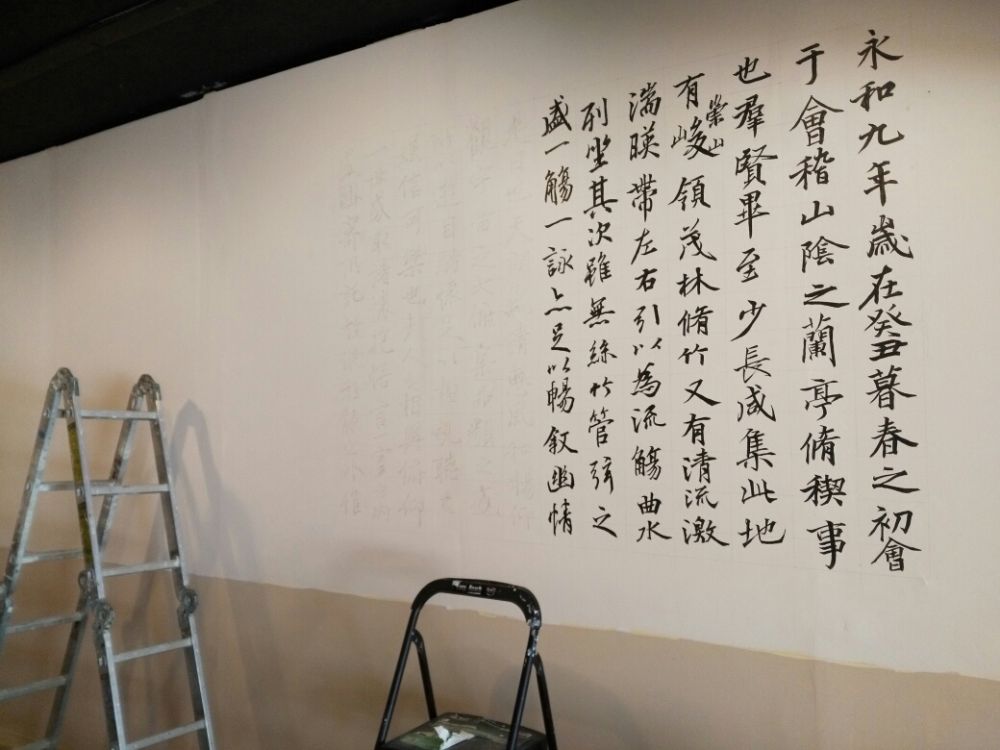 本来想减轻工作量,只摹写一部分。但是一实测这面墙,宽约7米,高2米7,再对照《兰亭序》原作的长宽比例,这么大的墙正适合容纳全文,只得给自己加码,勉为其难。要写字的篇幅是宽4米多,高近1米5。在这么大的墙上摹写,字体放大了几十倍,不可能像普通临帖那样凭空临摹,因为靠近墙面时,无法控制整体布局;也不能像匾上两个大字那样双钩复写,因为无需那么精确,不值得费那个劲。