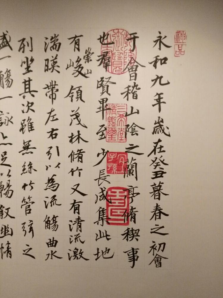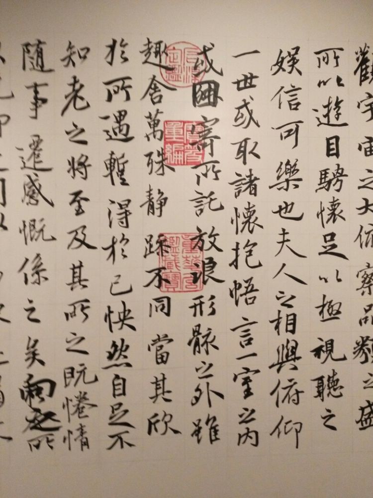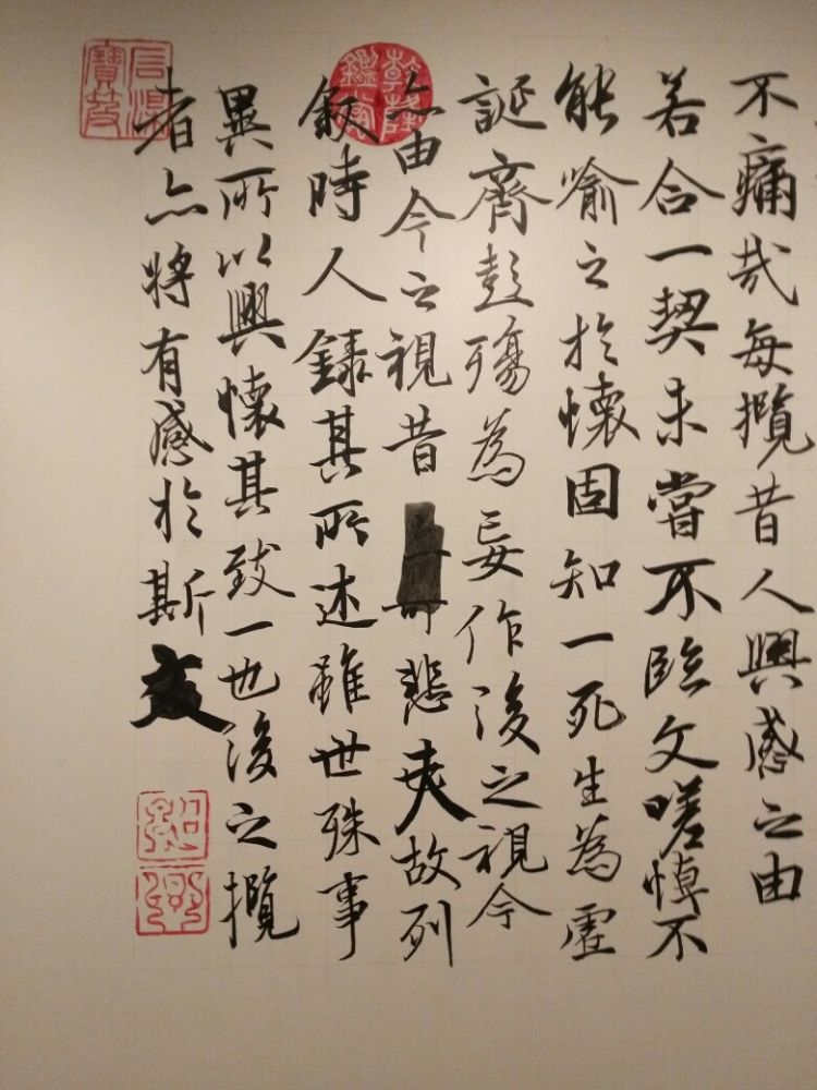如果靠近了看个别的字,对照原稿感觉略有偏差,或是拘谨不够灵活,但是离远些看整体,还是体现了王羲之的韵味,一望可知是《兰亭序》的笔法。连王羲之的涂改处,也照描不误。