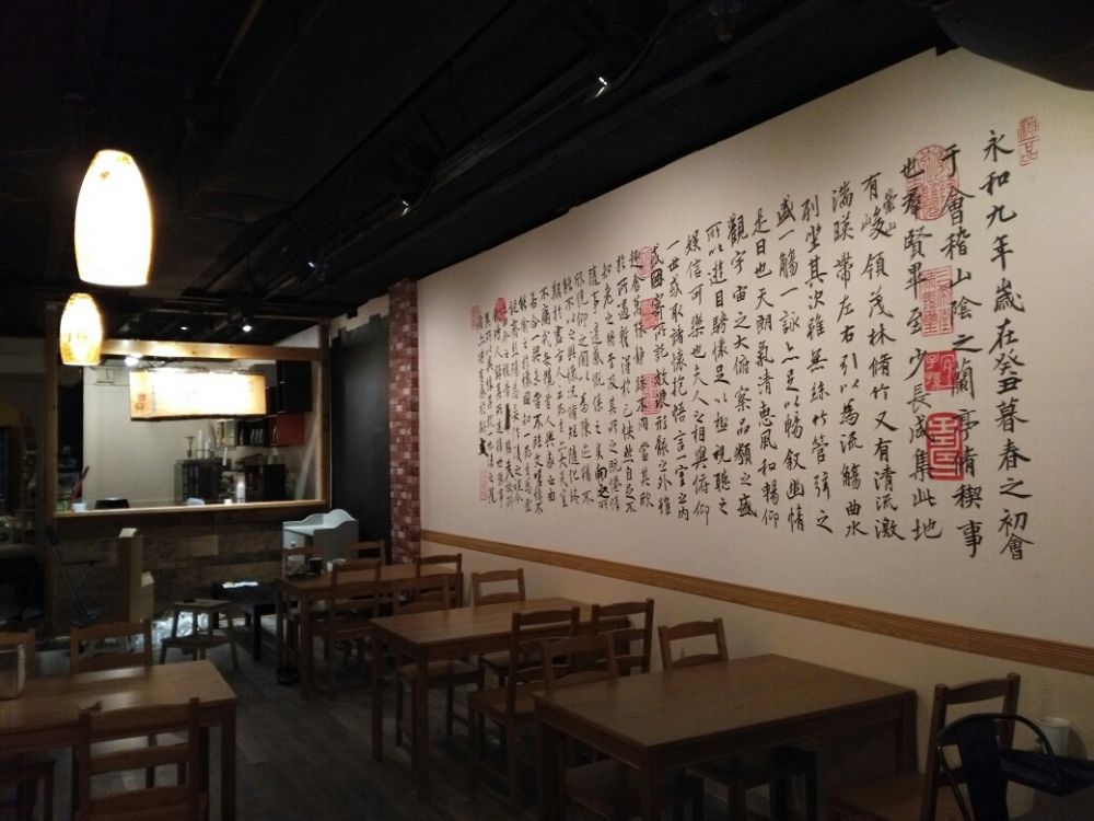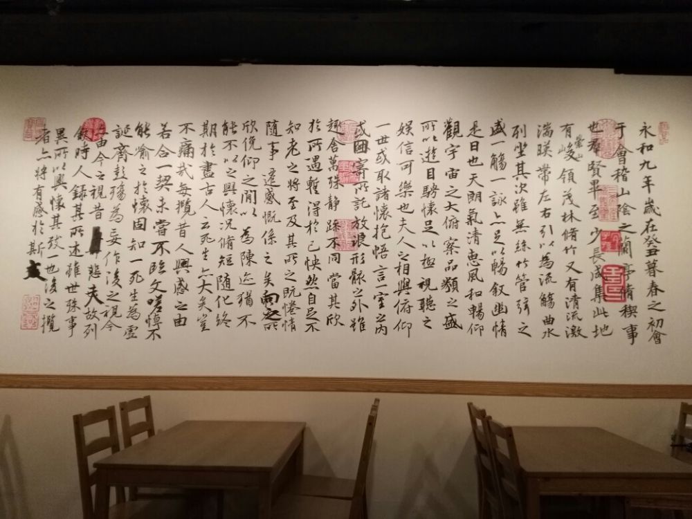 我积蓄已久的兰亭情结,这一次寄托到了木匾和壁书之上。如果它们使一家面馆增加了文化特色,如果吃面的食客们在大快朵颐之余,也能关注并欣赏我的才艺展示的话,我的情结发挥便具有了实用价值。精神与物质结合起来,方是功德圆满。