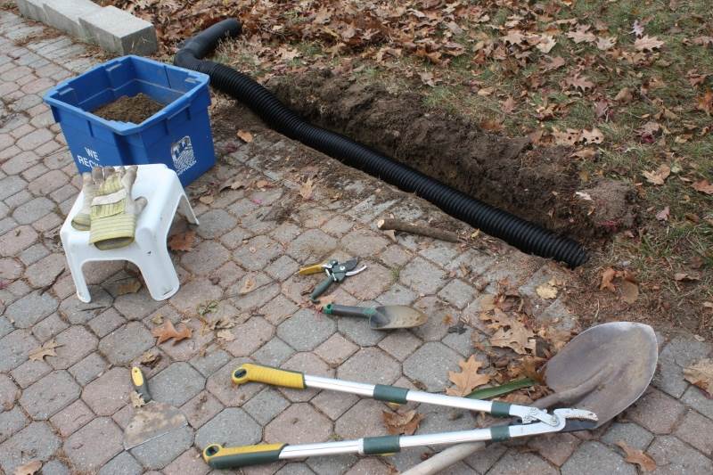 再说草地那边,是开挖一段,入管一段,填埋一段。挖的过程中遇到树根,就剪断扔出来。一共挖埋了40多英尺的距离,花了我好几天时间。