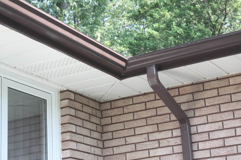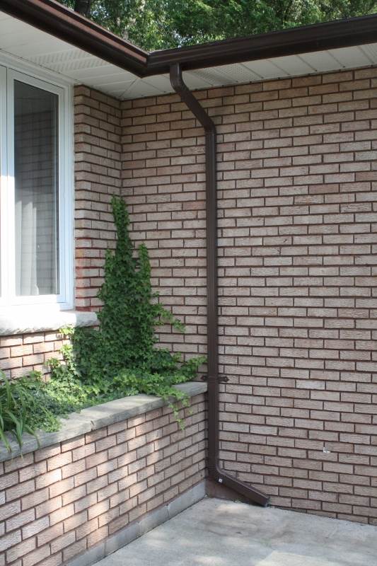 我的房子是横宽的平房,平面呈凹字形,左右跨度约80英尺,加上拐弯的回转,前脸的长度大约100英尺。在建房檐上的流水槽时,为了前景的美观,没有在前面装下水的直管。下水管都装在左右两边侧面,也就是相距100英尺以上。这样就造成了前檐排水不畅,流水槽横向输送太远,坡度不足。天长日久,水槽里堵了很多泥沙,就是有网子拦树叶也不能避免,就是常上去清理也不能彻底解决。这是设计问题而不是维护的问题。