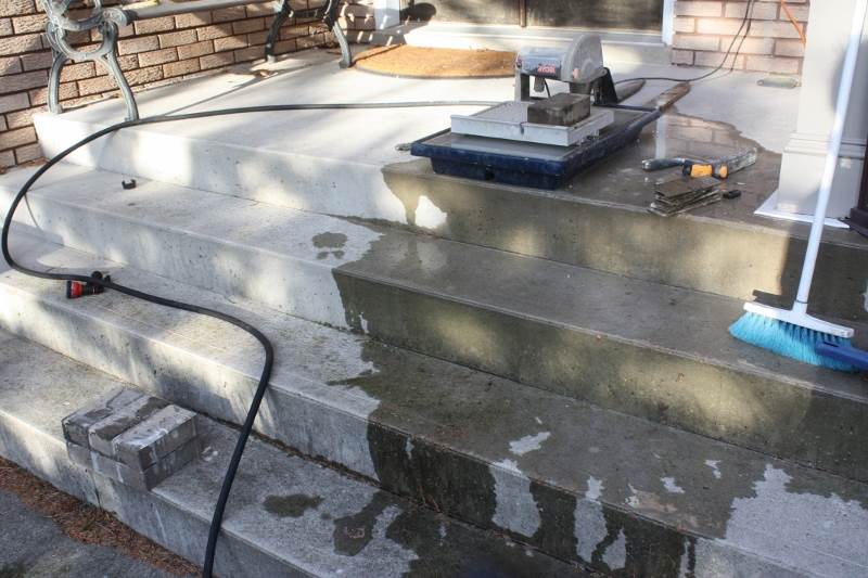 下水槽那边也要把铺地石砖填回去,但是就没有填土那么容易了,因为砖的宽度不合适了。幸亏我有原来在室内铺地砖的湿锯,用它来锯石砖,只不过是厚一点,但其硬度肯定不如瓷砖。在门前台阶上,正好可用浇花的水管供水,冷却降尘。把10块石砖各锯窄了约1/4英寸。