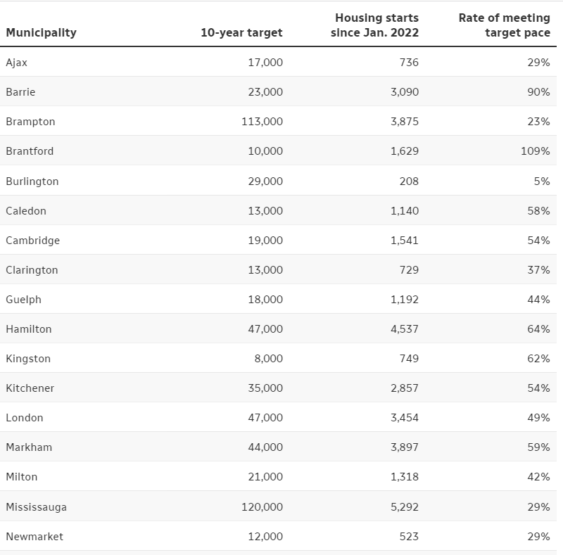 通过将加拿大抵押贷款和住房公司(CMHC)2022年1月至2023年6月的新房建设统计数据 与安省各大城市未来十年的目标进行比较,就可以衡量出每个城市的建设速度和目标完成情况。